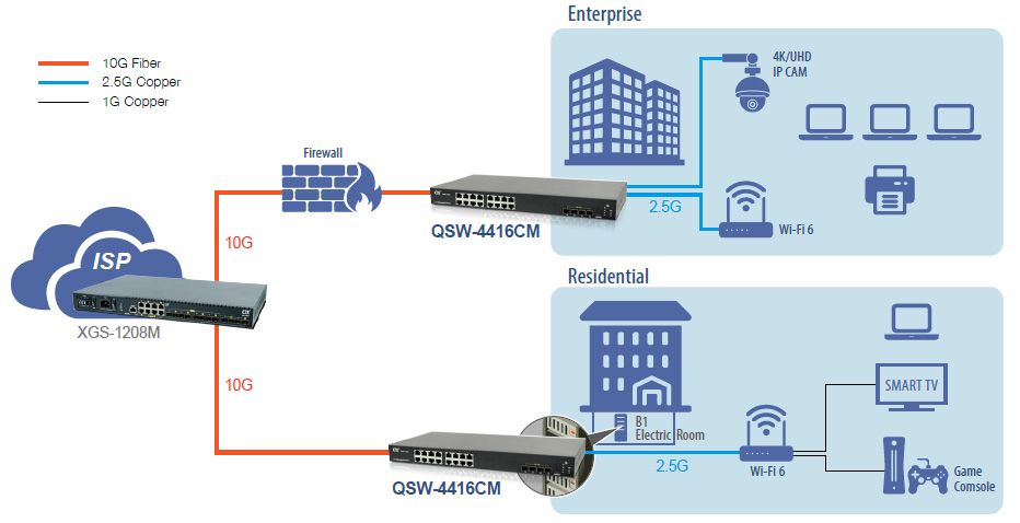 Die neueste Inhalts reichere Anwendung und Technologie wie WiFi 6/6E drahtloser Zugang und 4K UHD Video-Streaming oder IP-Überwachung machen das Standard-Gigabit die Problem der Bandbreitenknappheit offenbaren. QSW-4416CM ist mit 16 Ports 1G/2.5G RJ45 und 4 Slots 1G/10G SFP+ Uplink ausgestattet. Es bietet 2,5 Gbit/s und 10 Gbit/s Konnektivität, um den Bandbreitenbedarf beliebter Netzwerkgeräte zu erfüllen.