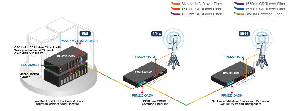 O CTC Union FRM220 CWDM MUX/DEMUX, OADM e Transponder 3R permitem conectividade CWDM em uma C-RAN (Rede de Acesso de Rádio em Nuvem) através de um link de fibra de fronthaul entre Unidades de Banda Base (BBU) e Cabeças de Rádio Remotas (RRH) localizadas em duas torres de celular diferentes.
