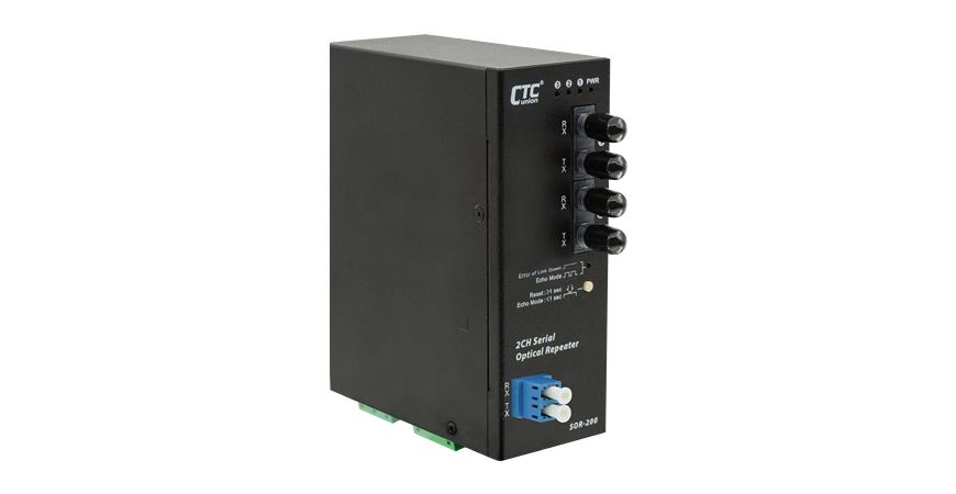 The Optical repeater, SOR-200, is a 2 channel serial optical signal over a long distance single mode fiber device. Asynchronous signals can be connected to client side port 1 and 2. thus two serial inputs with ST connectors are available and these can be multiplexed onto trunk port 3. Two devices with and optical interface can be connected to port 1 and 2 via MM fiber. These signals are transmitted to trunk port3 via 20km SM fiber with LC connector. The SOR-200 supports DC voltages or AC voltage sources. To supports commissioning, loops can be activated for client side port 1/2 so that the input signals are reflected at each port to support commissioning of the optical fiber connections.